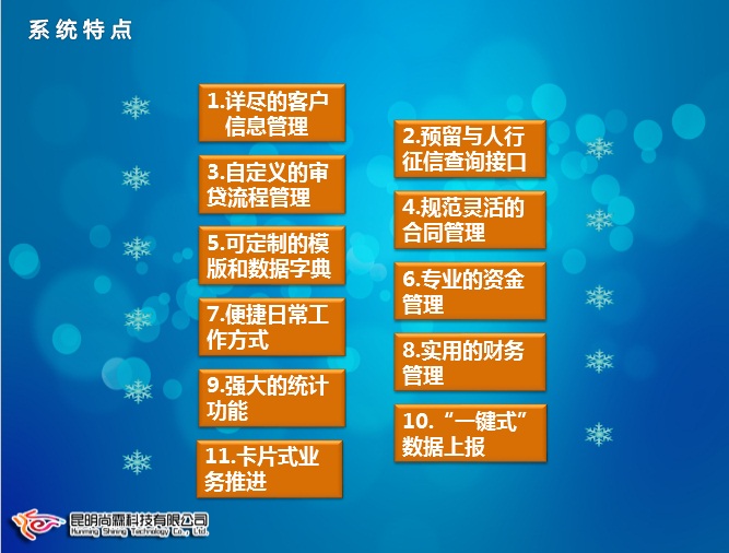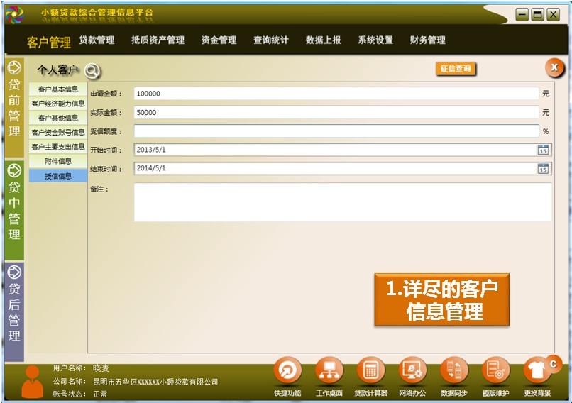 對(duì)于征信查詢:我們除了在系統(tǒng)中開(kāi)放了客戶內(nèi)部征信查詢的功能,也就是所有使用我們這套業(yè)務(wù)系統(tǒng)的小貸公司之間可以互相查詢彼此客戶的信用級(jí)別,是正常、黑名單、還有優(yōu)質(zhì)客戶等。另外,軟件還預(yù)留了接入人民銀行征信系統(tǒng)的征信查詢接口,屆時(shí),小貸公司在為企業(yè)放貸前,就可以通過(guò)人民銀行的征信系統(tǒng),查到該企業(yè)或個(gè)人在人民銀行征信數(shù)據(jù)庫(kù)內(nèi)的全部征信信息,據(jù)此作為重要的放貸依據(jù)。