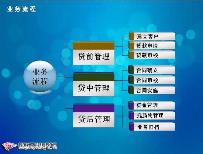 業(yè)務(wù)主線按照貸前管理、貸中管理、貸后管理設(shè)計(jì),將貸款業(yè)務(wù)貫穿到整個(gè)設(shè)計(jì)流程中,依步驟:建立客戶、貸款申請(qǐng)、貸款審核、合同確立、合同審核、合同實(shí)施、資金管理、抵質(zhì)物管理、業(yè)務(wù)歸檔,操作流程清晰,簡(jiǎn)單明了,實(shí)現(xiàn)業(yè)務(wù)流程管理的自動(dòng)化、智能化。