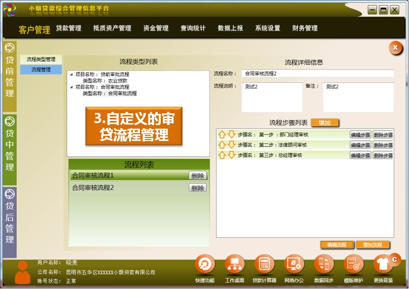 自定義貸款審批流程,可滿足不同公司對(duì)貸款流程的控制要求。小額貸款公司可根據(jù)自己的業(yè)務(wù)審批流程及部門和人員設(shè)置情況,自定義自己的貸款申請(qǐng)審核(貸前)和合同審核(貸中)流程。在軟件中,通過(guò)“流程管理”設(shè)置審批步驟、“賬號(hào)權(quán)限管理”設(shè)置審批角色用戶,實(shí)現(xiàn)流程化的逐級(jí)審批。按照規(guī)范的審批流程,實(shí)現(xiàn)業(yè)務(wù)自動(dòng)流轉(zhuǎn),提高業(yè)務(wù)處理效率的同時(shí),保證業(yè)務(wù)處理按流程進(jìn)展,體現(xiàn)業(yè)務(wù)處理過(guò)程的協(xié)作與透明,有效化解企業(yè)內(nèi)部人為風(fēng)險(xiǎn),隨時(shí)應(yīng)對(duì)小額貸款公司業(yè)務(wù)流程的創(chuàng)新變化。