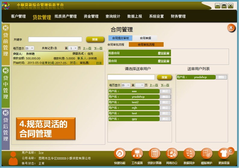 合同管理是小額貸款公司業(yè)務(wù)管理的核心內(nèi)容,包括合同生成、合同審核、合同實(shí)施三個(gè)階段。在完成貸前貸款申請(qǐng)、審核及反饋等步驟后,軟件會(huì) 自動(dòng)生成合同單據(jù);合同確立之后,必須按照用戶訂制的合同審核流程進(jìn)行合同審核,同時(shí)還包括合同實(shí)施階段抵質(zhì)資產(chǎn)接收和合同變更處理,合同管理過(guò)程規(guī)范。當(dāng)還款存在問(wèn)題或者拖欠利息等導(dǎo)致合同變更時(shí),可通過(guò)調(diào)整還款利率、還款期限、提前還款方式等重新生成還款計(jì)劃大大改善了常規(guī)系統(tǒng)只注重業(yè)務(wù)過(guò)程和執(zhí)行過(guò)程、合同變更復(fù)雜的缺點(diǎn),實(shí)現(xiàn)智能化、靈活化的合同變更。