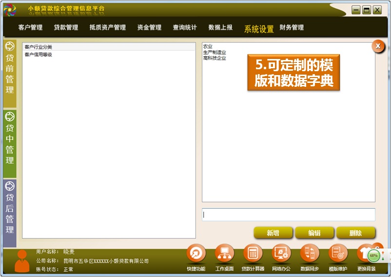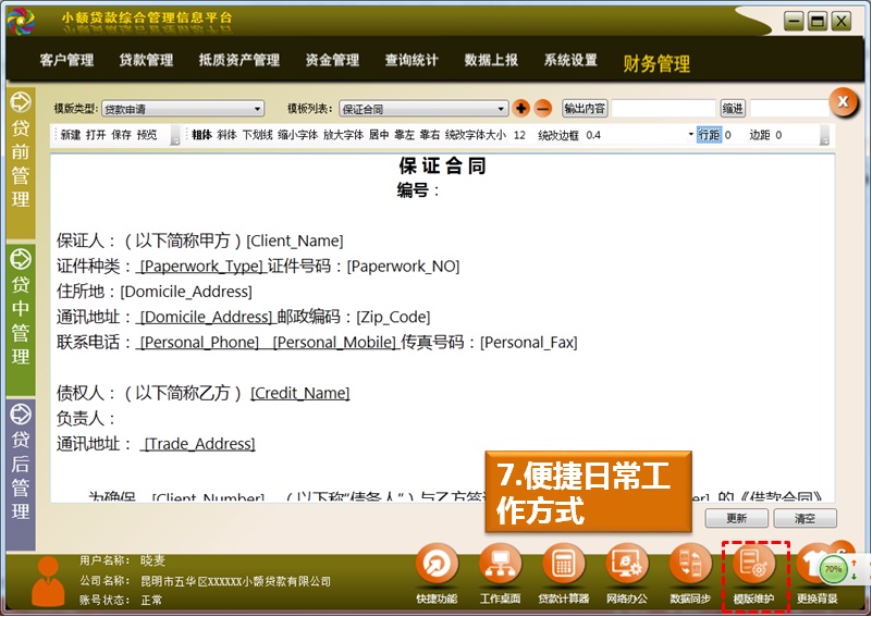 由于各小貸公司目前在財(cái)務(wù)報(bào)表、合同(如借款合同、保證合同、抵押合同等)、通知(抵質(zhì)資產(chǎn)收妥通知書、放款通知單等)、票據(jù)、附件內(nèi)容等方面沒(méi)有統(tǒng)一的模版和數(shù)據(jù)字典,考慮到用戶的習(xí)慣和操作方便,可在軟件中定制適合各自小貸公司的相關(guān)內(nèi)容,極大滿足用戶的個(gè)性化需求。