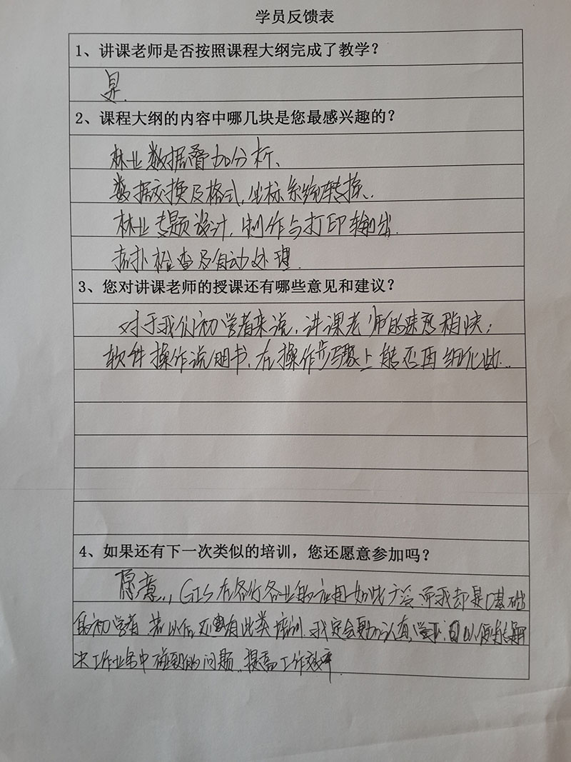 我公司有多年服務(wù)林業(yè)和農(nóng)業(yè)地理信息技術(shù)的軟件和培訓(xùn)的經(jīng)驗(yàn),對(duì)林業(yè)管理人員和基層技術(shù)人員的需求非常了解,能夠制定符合林業(yè)、農(nóng)業(yè)地理信息應(yīng)用的教學(xué)大綱,從而保證培訓(xùn)的質(zhì)量,受到了廣大林業(yè)和農(nóng)業(yè)業(yè)務(wù)人員的歡迎。